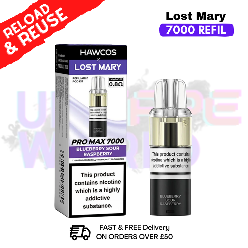 Discover the vibrant flavour of Blueberry Sour Raspberry with this replacement pod for your Lost Mary 7K Pro Max Pod Kit. Delivering up to 7000 puffs per pod, this prefilled pod brings Juicy blueberry blended with tangy raspberry, delivering a sweet, sharp, and refreshing fruity vape.