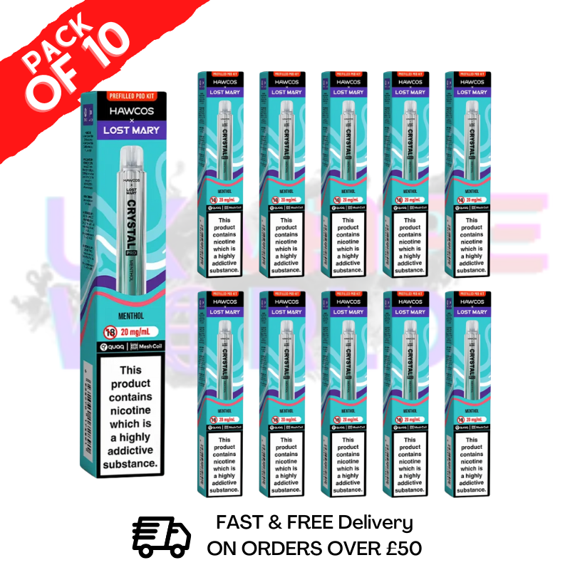 Shop Menthol – Lost Mary Crystal Pro 600 KITS (Box of 10) is a cool and invigorating, this pure menthol flavour delivers an icy rush with each puff, offering a crisp, refreshing vape that soothes and awakens the senses. Lost Mary Crystal Pro 600!
